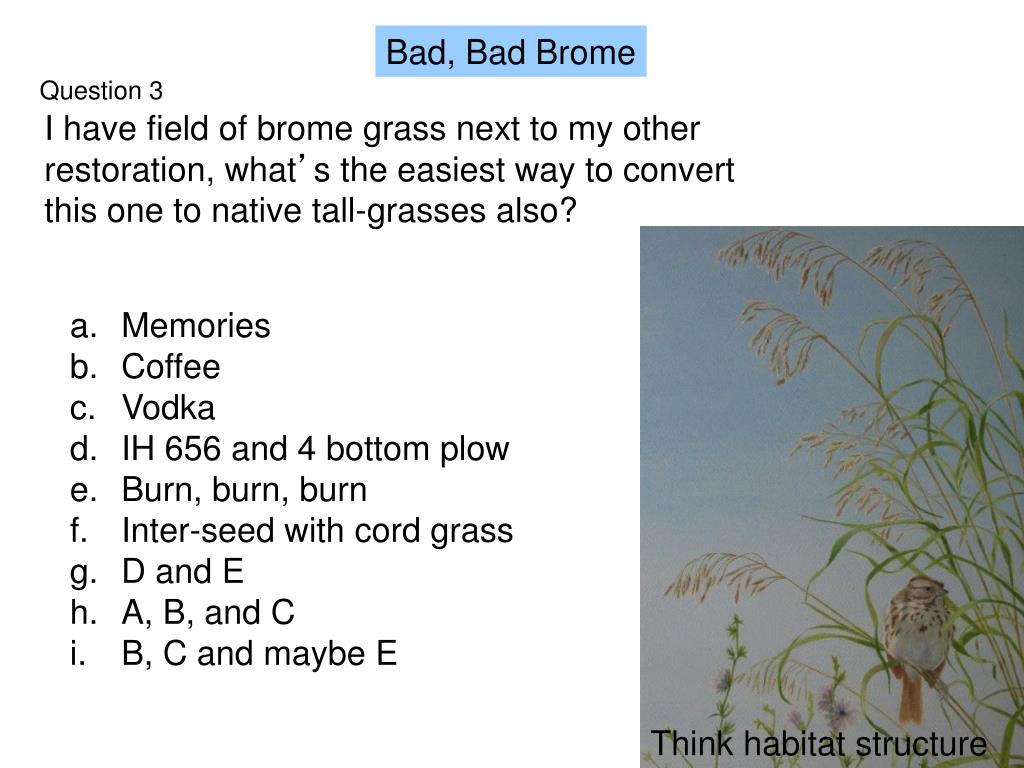 Question 3 I have field of brome grass next to my other restoration, what’s the easiest way to convert this one to native tall-grasses also? Bad, Bad Brome Memories Coffee Vodka IH 656 and 4 bottom plow Burn, burn, burn Inter-seed with cord grass D and E A, B, and C B, C and maybe E Think habitat structure