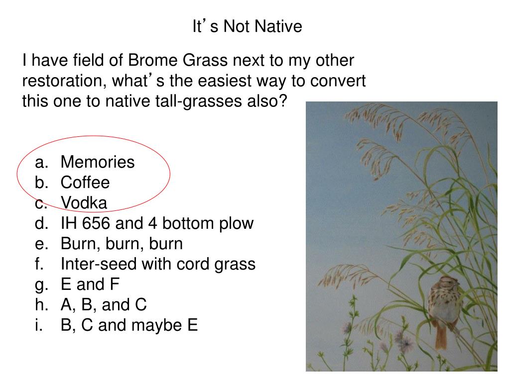 It’s Not Native I have field of Brome Grass next to my other restoration, what’s the easiest way to convert this one to native tall-grasses also? Memories Coffee Vodka IH 656 and 4 bottom plow Burn, burn, burn Inter-seed with cord grass E and F A, B, and C B, C and maybe E