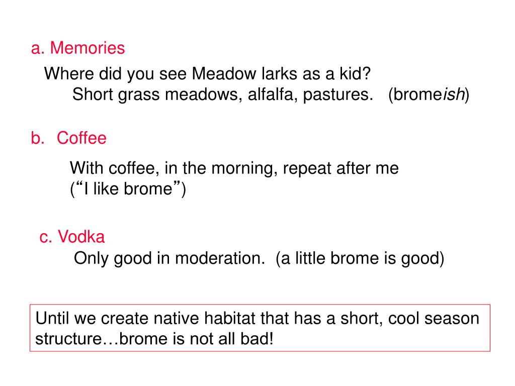 Coffee With coffee, in the morning, repeat after me (“I like brome”) c. Vodka Only good in moderation. (a little brome is good) a. Memories Where did you see Meadow larks as a kid? Short grass meadows, alfalfa, pastures. (bromeish) Until we create native habitat that has a short, cool season structure…brome is not all bad!