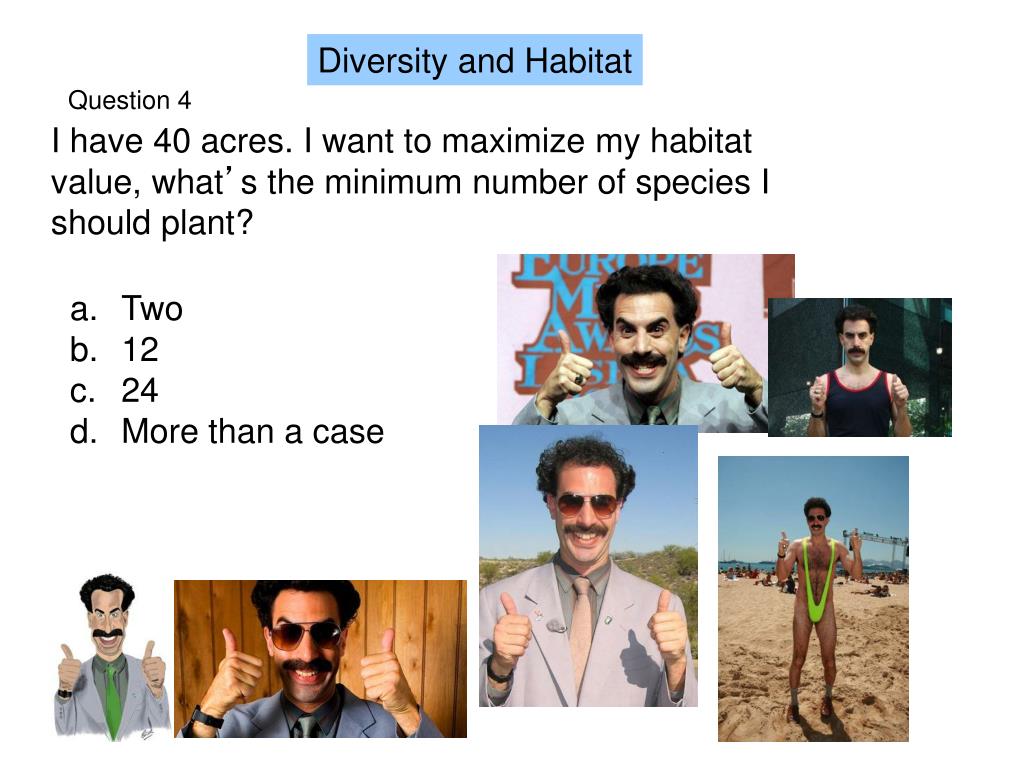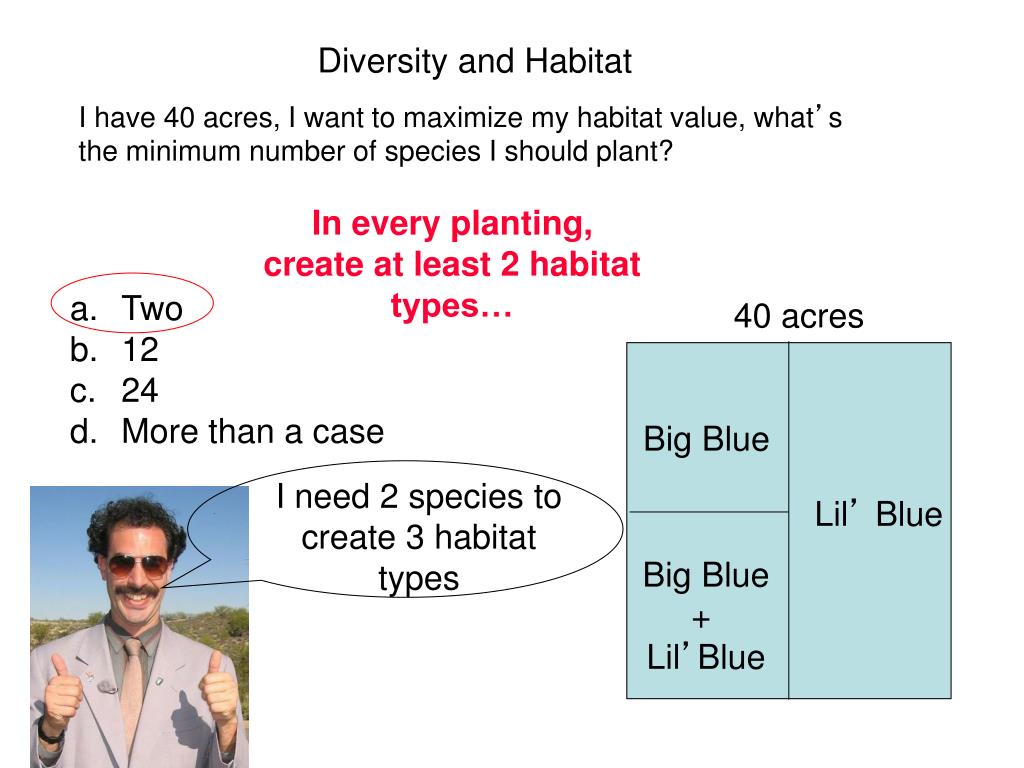 Question 4 I have 40 acres. I want to maximize my habitat value, what’s the minimum number of species I should plant? Diversity and Habitat Two 12 24 More than a case