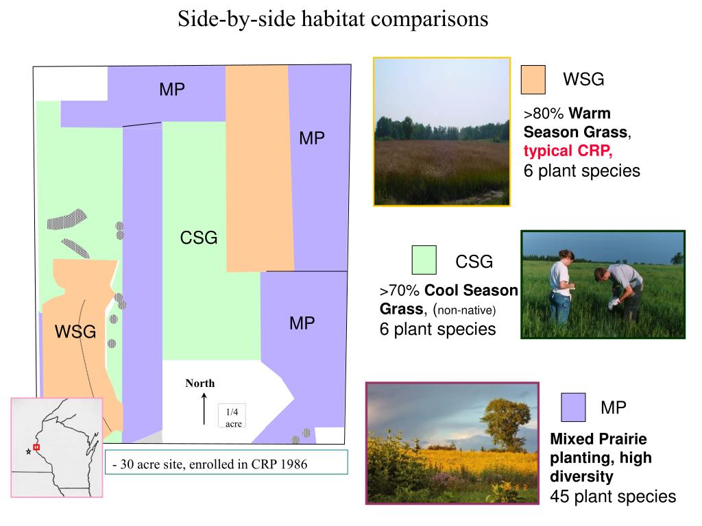 Side-by-side habitat comparisons North 1/4 acre WSG MP >80% Warm Season Grass, typical CRP, 6 plant species MP CSG CSG >70% Cool Season Grass, (non-native) 6 plant species MP WSG MP Mixed Prairie planting, high diversity 45 plant species - 30 acre site, enrolled in CRP 1986