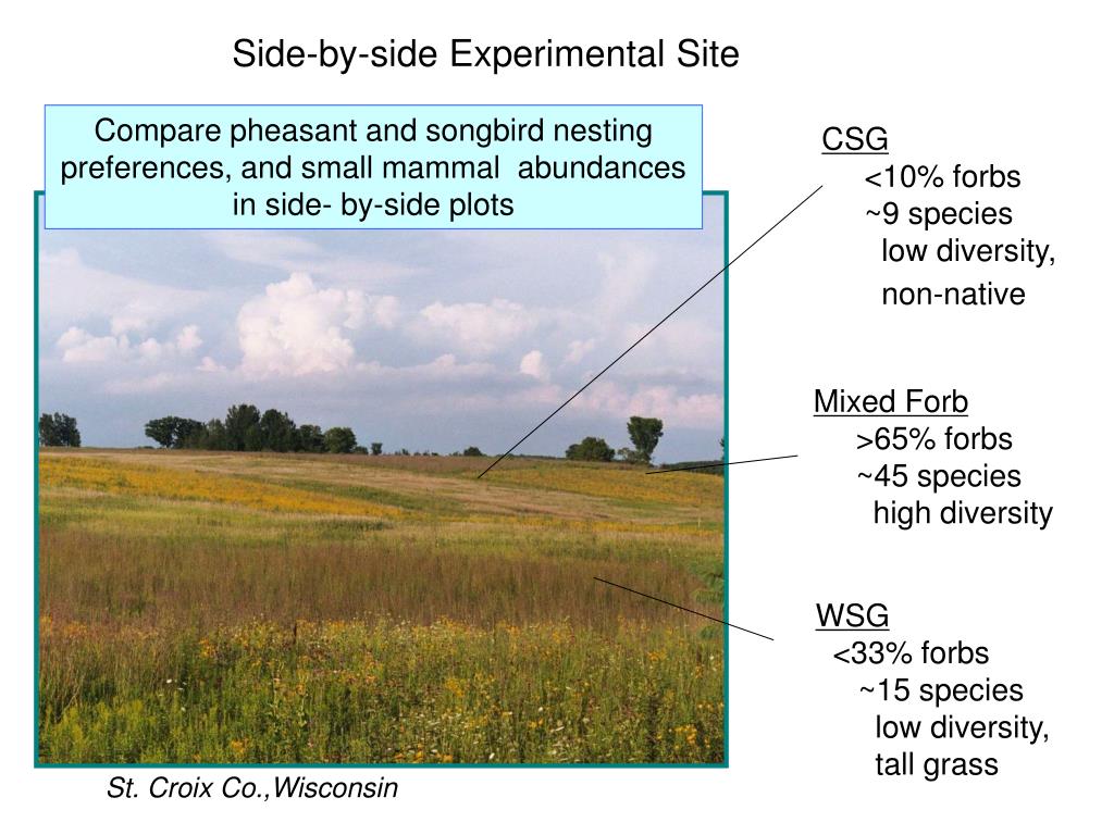 Side-by-side Experimental Site Compare pheasant and songbird nesting preferences, and small mammal abundances in side- by-side plots CSG <10% forbs ~9 species low diversity, non-native Mixed Forb >65% forbs ~45 species high diversity WSG <33% forbs ~15 species low diversity, tall grass St. Croix Co.,Wisconsin