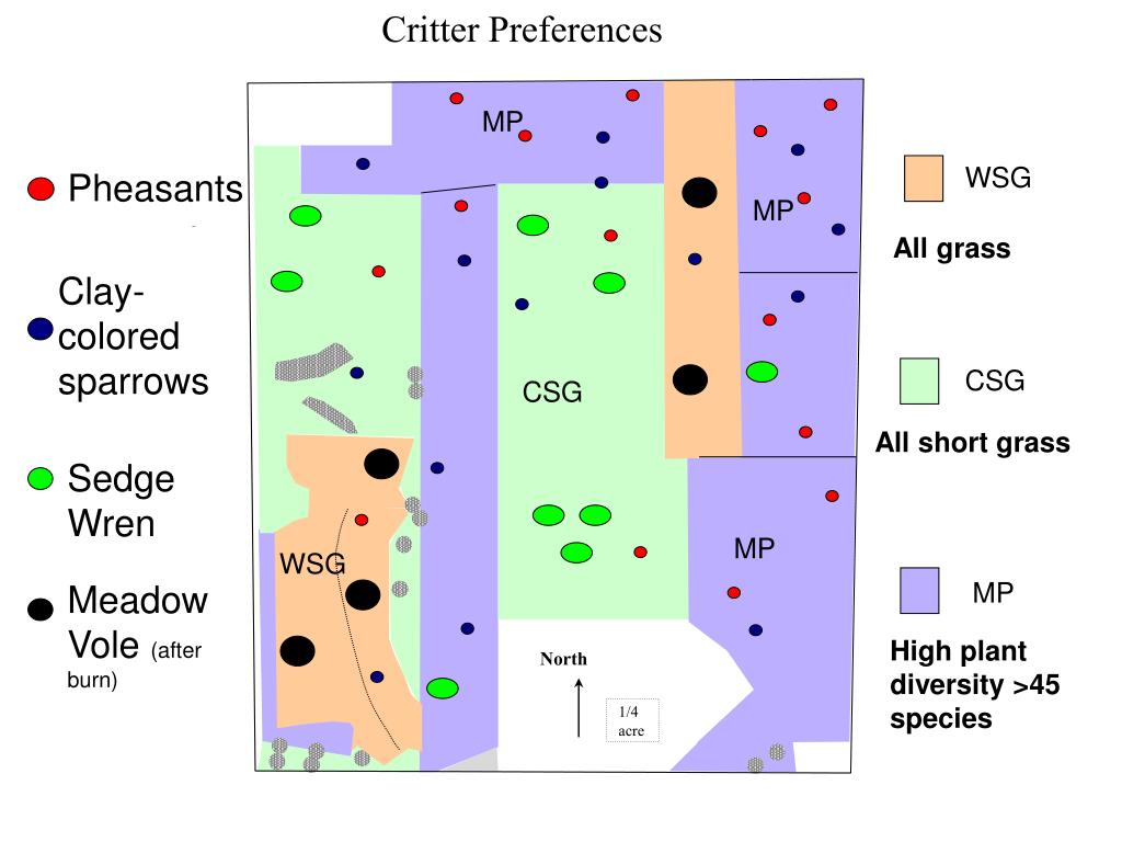Critter Preferences MP Pheasants MP Clay-colored sparrows CSG Sedge Wren MP WSG Meadow Vole (after burn) North 1/4 acre WSG All grass CSG All short grass MP High plant diversity >45 species