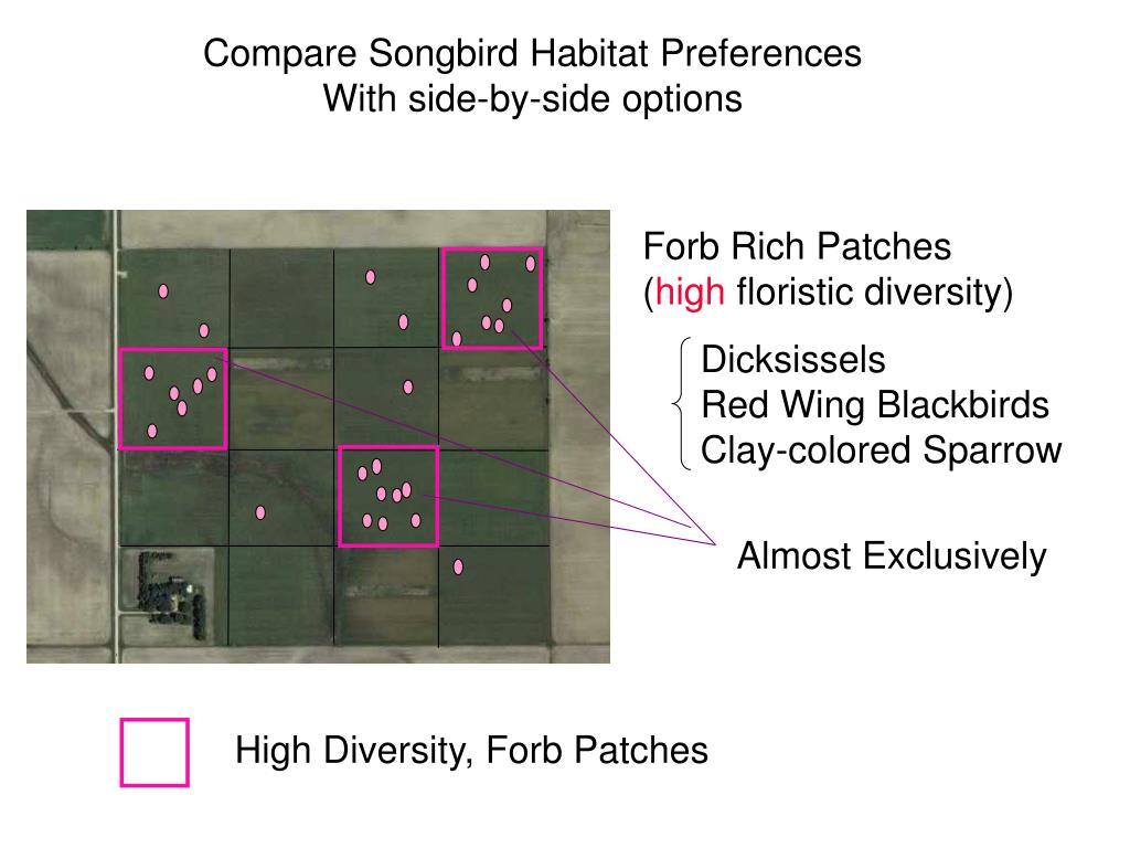 Forb Rich Patches (high floristic diversity) Dicksissels Red Wing Blackbirds Clay-colored Sparrow Almost Exclusively High Diversity, Forb Patches Compare Songbird Habitat Preferences With side-by-side options