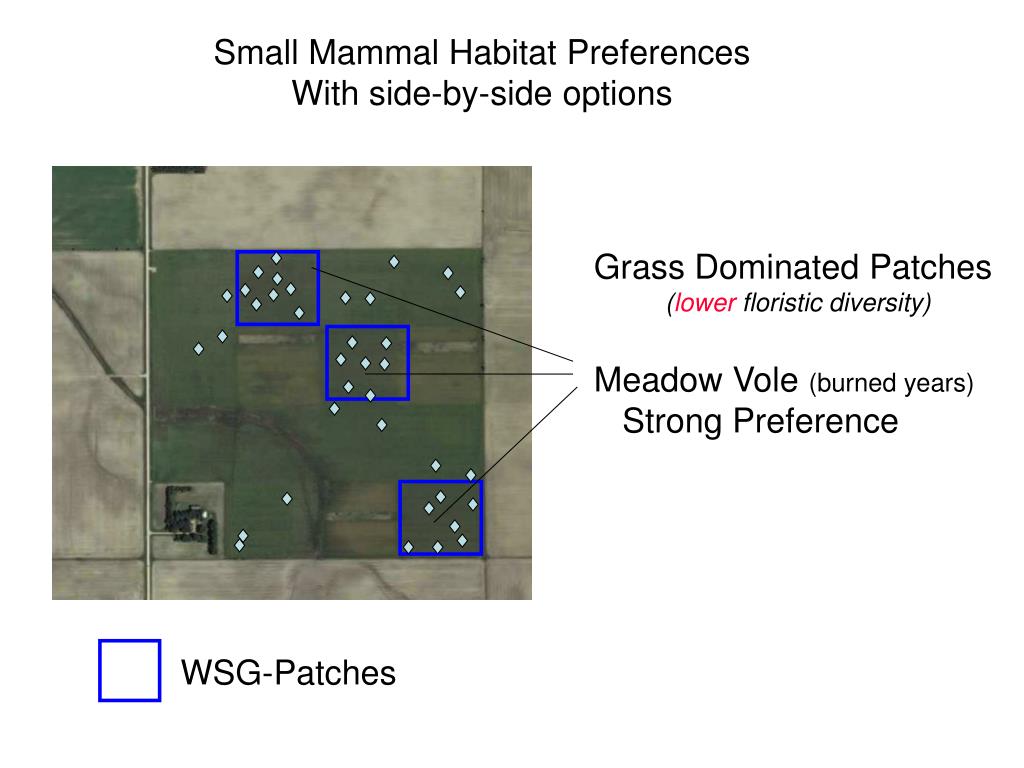 Small Mammal Habitat Preferences With side-by-side options Grass Dominated Patches (lower floristic diversity) Meadow Vole (burned years) Strong Preference WSG-Patches