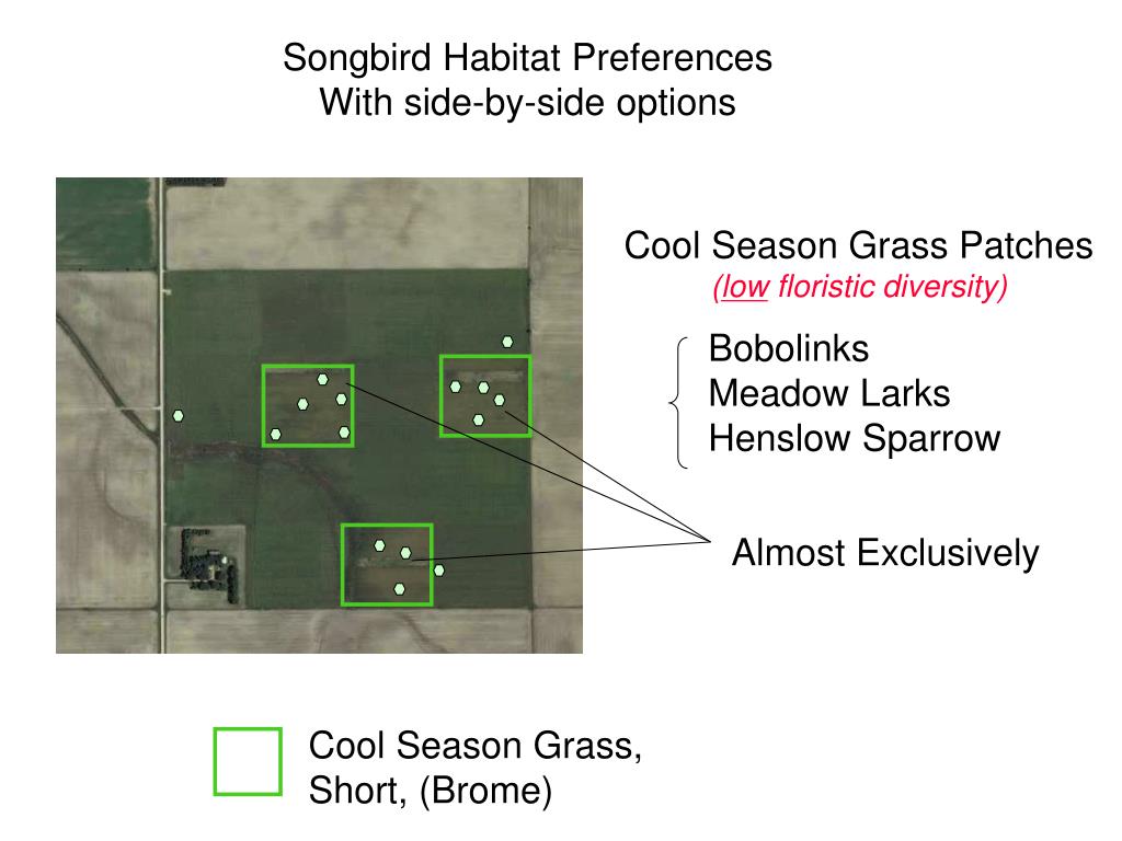 Cool Season Grass Patches (low floristic diversity) Almost Exclusively Cool Season Grass, Short, (Brome) Songbird Habitat Preferences With side-by-side options Bobolinks Meadow Larks Henslow Sparrow