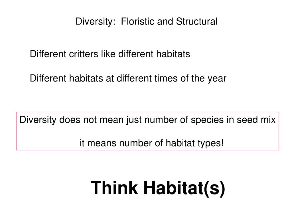 Diversity: Floristic and Structural Different critters like different habitats Different habitats at different times of the year Diversity does not mean just number of species in seed mix it means number of habitat types! Think Habitat(s)