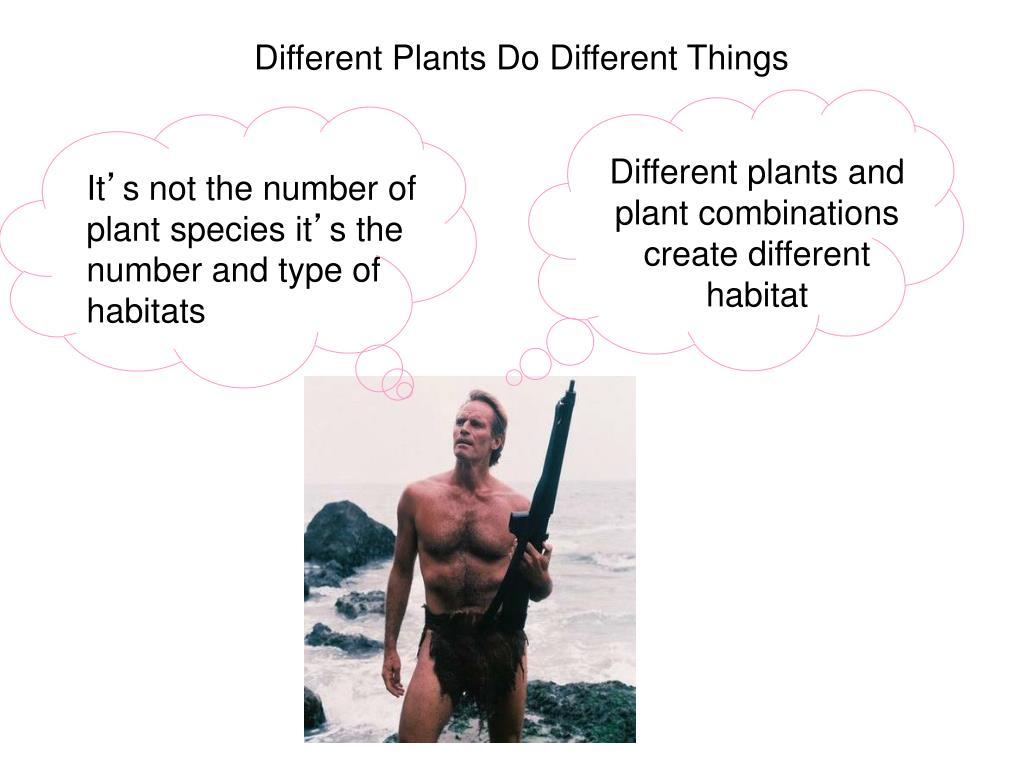 Different plants and plant combinations create different habitat It’s not the number of plant species it’s the number and type of habitats Different Plants Do Different Things