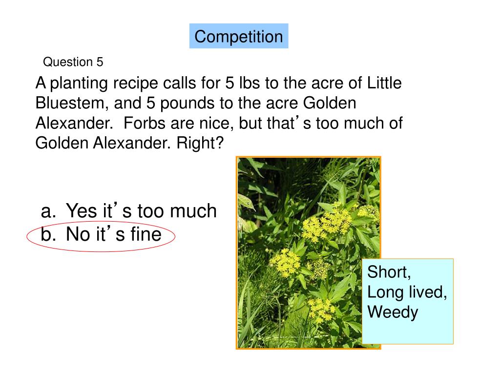Question 5 A planting recipe calls for 5 lbs to the acre of Little Bluestem, and 5 pounds to the acre Golden Alexander. Forbs are nice, but that’s too much of Golden Alexander. Right? Competition Yes it’s too much No it’s fine Short, Long lived, Weedy