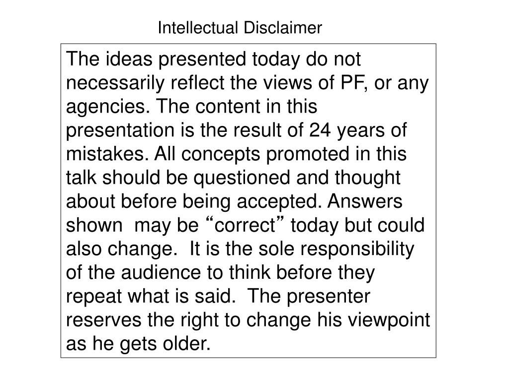 Intellectual Disclaimer The ideas presented today do not necessarily reflect the views of PF, or any agencies. The content in this presentation is the result of 24 years of mistakes. All concepts promoted in this talk should be questioned and thought about before being accepted. Answers shown may be “correct” today but could also change. It is the sole responsibility of the audience to think before they repeat what is said. The presenter reserves the right to change his viewpoint as he gets older.