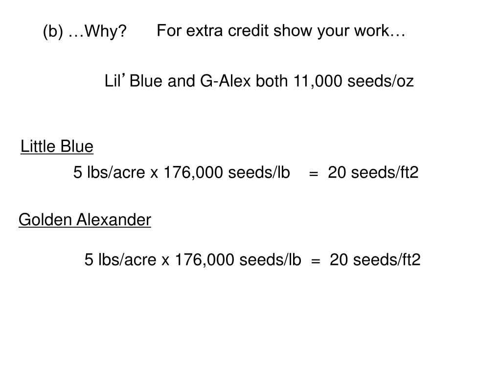 For extra credit show your work… (b) …Why? Little Blue 5 lbs/acre x 176,000 seeds/lb = 20 seeds/ft2 Golden Alexander 5 lbs/acre x 176,000 seeds/lb = 20 seeds/ft2 Lil’Blue and G-Alex both 11,000 seeds/oz