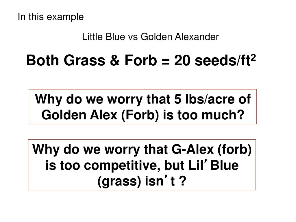 In this example Little Blue vs Golden Alexander Both Grass & Forb = 20 seeds/ft2 Why do we worry that 5 lbs/acre of Golden Alex (Forb) is too much? Why do we worry that G-Alex (forb) is too competitive, but Lil’Blue (grass) isn’t ?