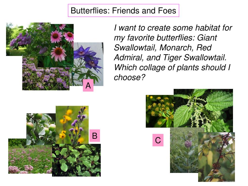 Butterflies: Friends and Foes I want to create some habitat for my favorite butterflies: Giant Swallowtail, Monarch, Red Admiral, and Tiger Swallowtail. Which collage of plants should I choose? A B C