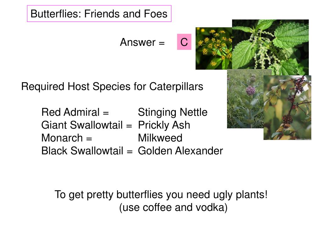 Butterflies: Friends and Foes Answer = C Required Host Species for Caterpillars Red Admiral = Stinging Nettle Giant Swallowtail = Prickly Ash Monarch = Milkweed Black Swallowtail = Golden Alexander To get pretty butterflies you need ugly plants! (use coffee and vodka)