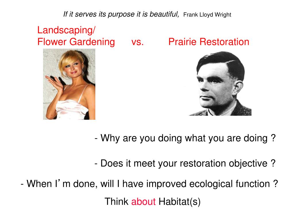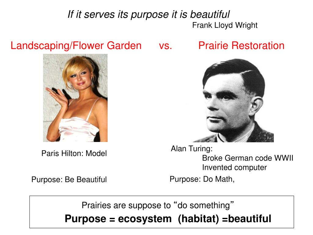 Paris Hilton: Model Purpose: Be Beautiful Prairies are suppose to “do something” Purpose = ecosystem (habitat) =beautiful If it serves its purpose it is beautiful Frank Lloyd Wright Landscaping/Flower Garden vs. Prairie Restoration Beautiful. Yes! Beautiful. ? Alan Turing: Broke German code WWII Invented computer Purpose: Do Math,