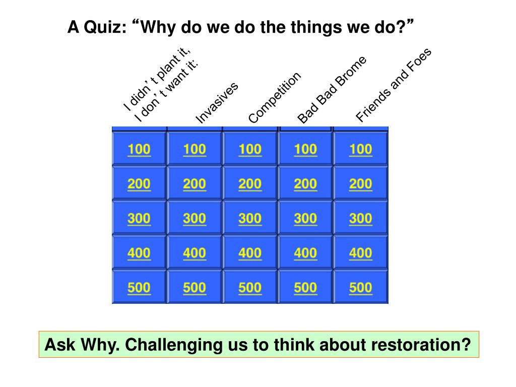 A Quiz: “Why do we do the things we do?” I didn’t plant it, I don’t want it: Friends and Foes Invasives Bad Bad Brome Competition Ask Why. Challenging us to think about restoration?