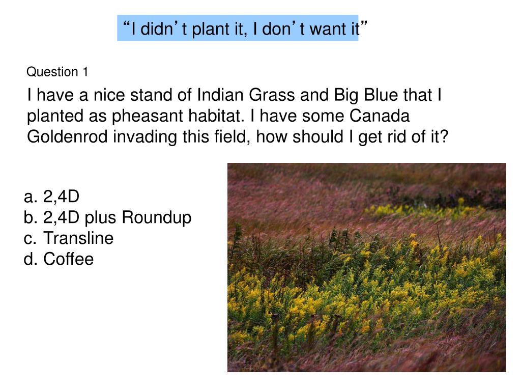 Question 1 I have a nice stand of Indian Grass and Big Blue that I planted as pheasant habitat. I have some Canada Goldenrod invading this field, how should I get rid of it? “I didn’t plant it, I don’t want it” 2,4D 2,4D plus Roundup Transline Coffee