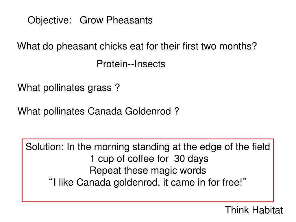 Objective: Grow Pheasants What do pheasant chicks eat for their first two months? Protein--Insects What pollinates grass ? What pollinates Canada Goldenrod ? Solution: In the morning standing at the edge of the field 1 cup of coffee for 30 days Repeat these magic words “I like Canada goldenrod, it came in for free!” Think Habitat