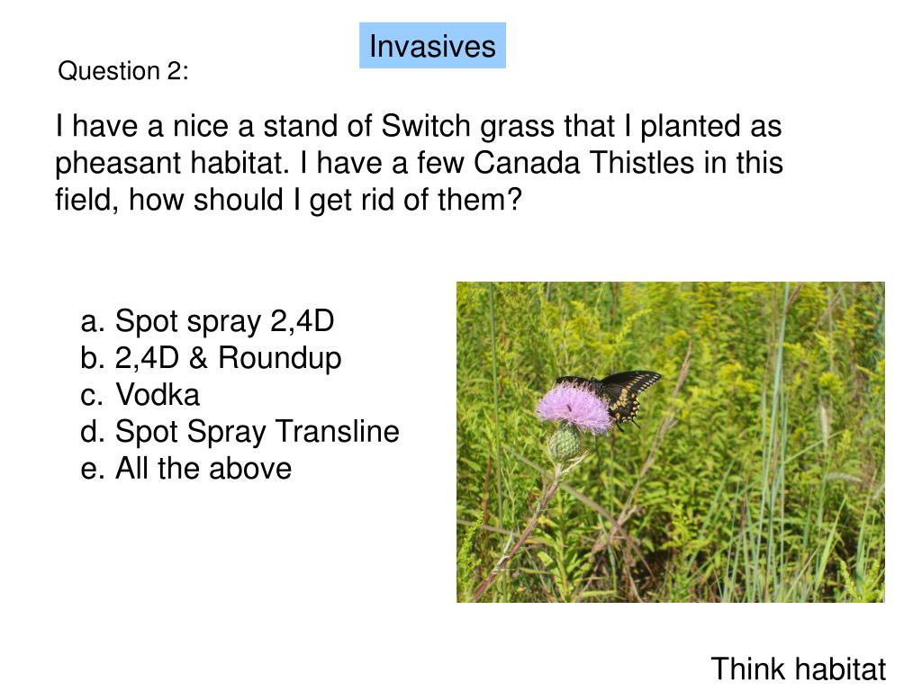 Question 2: I have a nice a stand of Switch grass that I planted as pheasant habitat. I have a few Canada Thistles in this field, how should I get rid of them? Invasives Spot spray 2,4D 2,4D & Roundup Vodka Spot Spray Transline All the above Think habitat