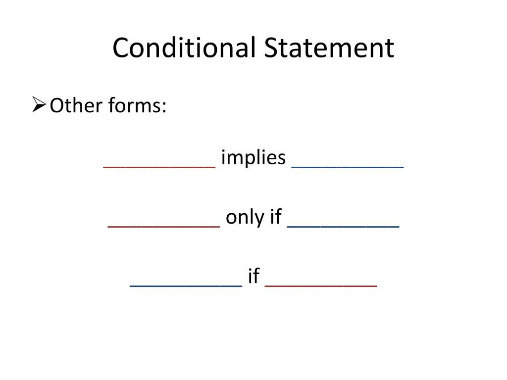 Conditional Statement • Other forms: __________ implies __________ __________ only if __________ __________ if __________