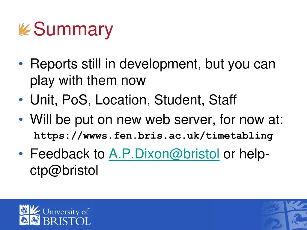 Summary • Reports still in development, but you can play with them now • Unit, PoS, Location, Student, Staff • Will be put on new web server, for now at: https://wwws.fen.bris.ac.uk/timetabling • Feedback to A.P.Dixon@bristol or help-ctp@bristol