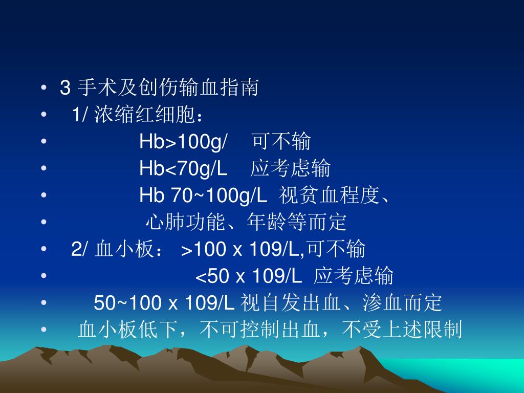 3 手术及创伤输血指南 • 1/ 浓缩红细胞: • Hb>100g/ 可不输 • Hb<70g/L 应考虑输 • Hb 70~100g/L 视贫血程度、 • 心肺功能、年龄等而定 • 2/ 血小板: >100 x 109/L,可不输 • <50 x 109/L 应考虑输 • 50~100 x 109/L 视自发出血、渗血而定 • 血小板低下,不可控制出血,不受上述限制