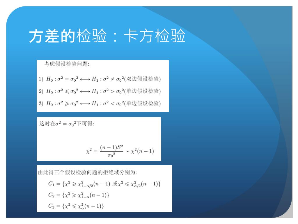 检验步骤 • 1) 提出原假设H0与备择假设H1; • 2) 选择检验统计量W并确定其分布; • 3) 在给定的显著性水平下, 确定H0关于统计量W的拒绝域; • 4) 算出样本点对应的检验统计量的值; • 5) 判断: 若统计量的值落在拒绝域内, 则拒绝H0, 否则接受H0.