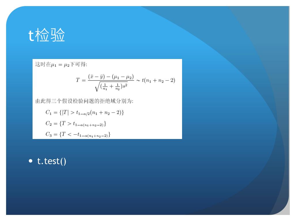 p值 • 定义: 在一个假设检验问题中, 拒绝原假设H0的最小显著性水平称为检验的p值. (最小犯第一类错误的概率)。 • p值越小, 表示原假设越可疑, 从而越应拒绝原假设。 • 由检验的p值与人们心目中的显著性水平进行比较可以很容易做出检验的结论: 如果 p < alpha, 则在显著性水平alpha下拒绝H0; 如果p>alpha, 则在显著性水平alpha下保留H0.