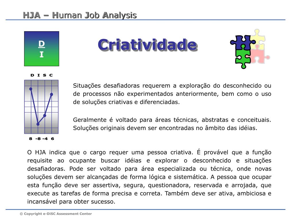 D I Criatividade Situações desafiadoras requerem a exploração do desconhecido ou de processos não experimentados anteriormente, bem como o uso de soluções criativas e diferenciadas. Geralmente é voltado para áreas técnicas, abstratas e conceituais. Soluções originais devem ser encontradas no âmbito das idéias. O HJA indica que o cargo requer uma pessoa criativa. É provável que a função requisite ao ocupante buscar idéias e explorar o desconhecido e situações desafiadoras. Pode ser voltado para área especializada ou técnica, onde novas soluções devem ser alcançadas de forma lógica e sistemática. A pessoa que ocupar esta função deve ser assertiva, segura, questionadora, reservada e arrojada, que execute as tarefas de forma precisa e correta. Também deve ser ativa, ambiciosa e incansável para obter sucesso.