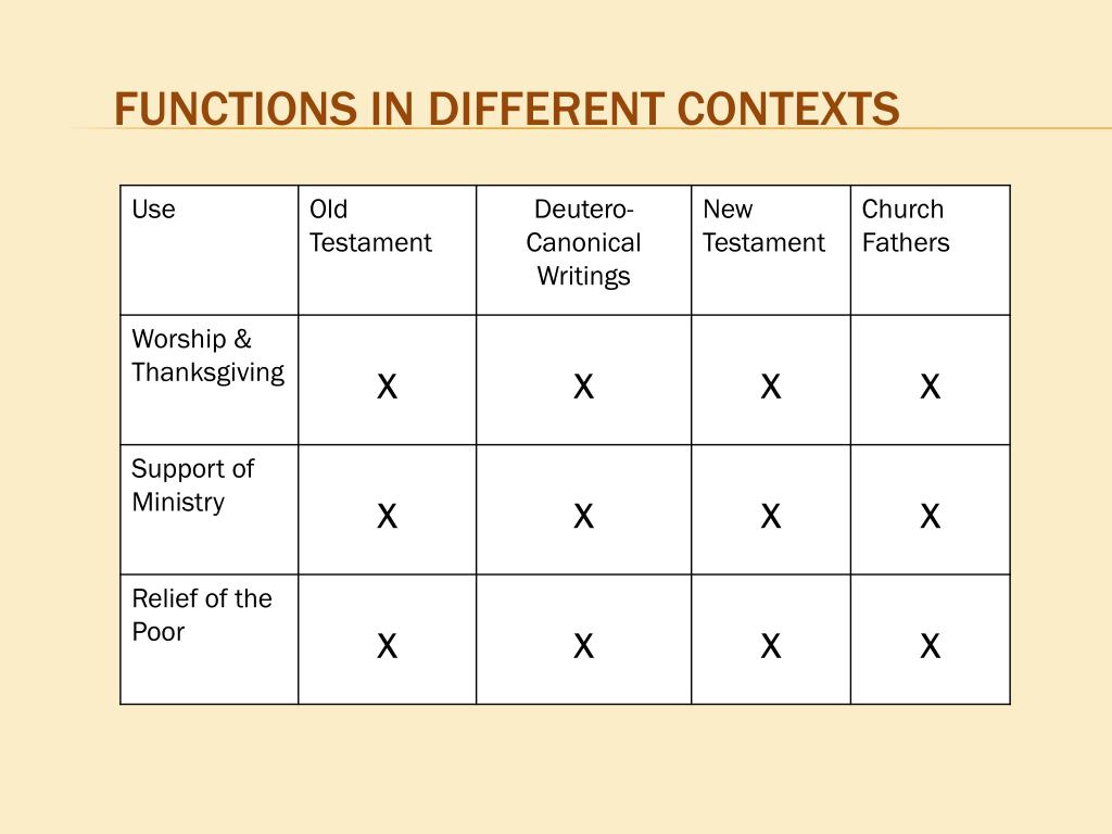 Three functions (uses) of tithe based on the three types: • Worship and Thanksgiving • Support of ministry • Relief of the poor Types According to Function Tobit Giving Alms
