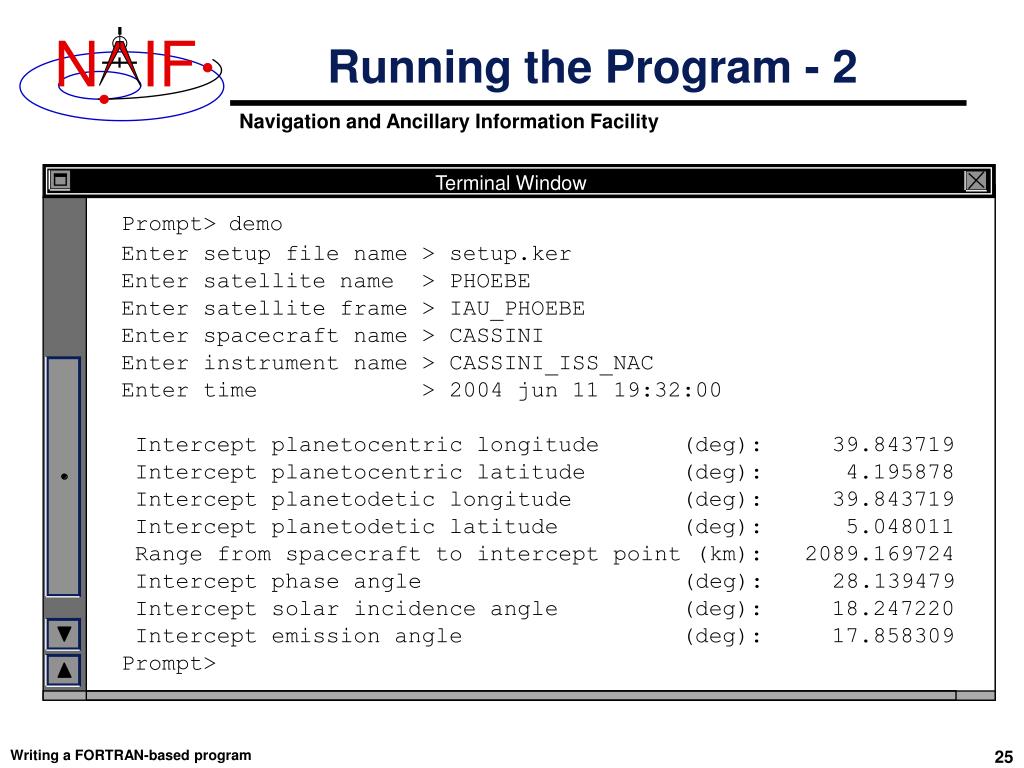 Terminal Window Running the Program - 2 Prompt> demo Enter setup file name > setup.ker Enter satellite name > PHOEBE Enter satellite frame > IAU_PHOEBE Enter spacecraft name > CASSINI Enter instrument name > CASSINI_ISS_NAC Enter time > 2004 jun 11 19:32:00 Intercept planetocentric longitude (deg): 39.843719 Intercept planetocentric latitude (deg): 4.195878 Intercept planetodetic longitude (deg): 39.843719 Intercept planetodetic latitude (deg): 5.048011 Range from spacecraft to intercept point (km): 2089.169724 Intercept phase angle (deg): 28.139479 Intercept solar incidence angle (deg): 18.247220 Intercept emission angle (deg): 17.858309 Prompt> Writing a FORTRAN-based program