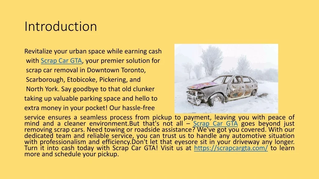 Introduction Revitalize your urban space while earning cash with Scrap Car GTA, your premier solution for scrap car removal in Downtown Toronto, Scarborough, Etobicoke, Pickering, and North York. Say goodbye to that old clunker taking up valuable parking space and hello to extra money in your pocket! Our hassle-free service ensures a seamless process from pickup to payment, leaving you with peace of mind and a cleaner environment.Butthat's not all – Scrap Car GTA goes beyond just removing scrap cars. Need towing or roadside assistance? We've got you covered. With our dedicated team and reliable service, you can trust us to handle any automotive situation with professionalism and efficiency.Don'tlet that eyesore sit in your driveway any longer. Turn it into cash today with Scrap Car GTA! Visit us at https://scrapcargta.com/ to learn more and schedule your pickup.