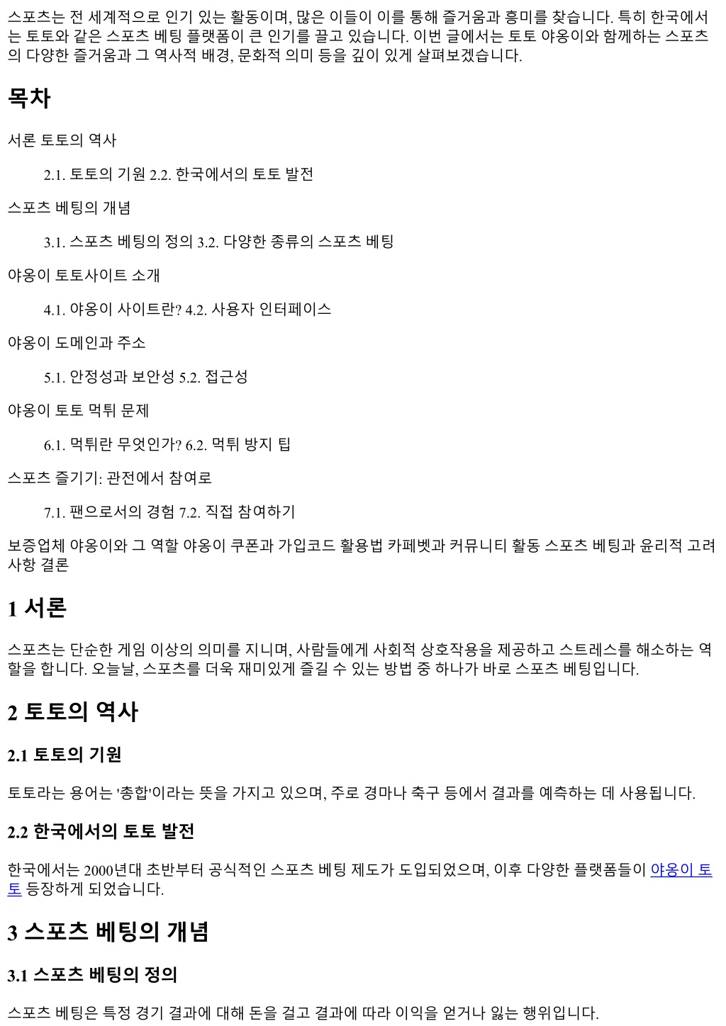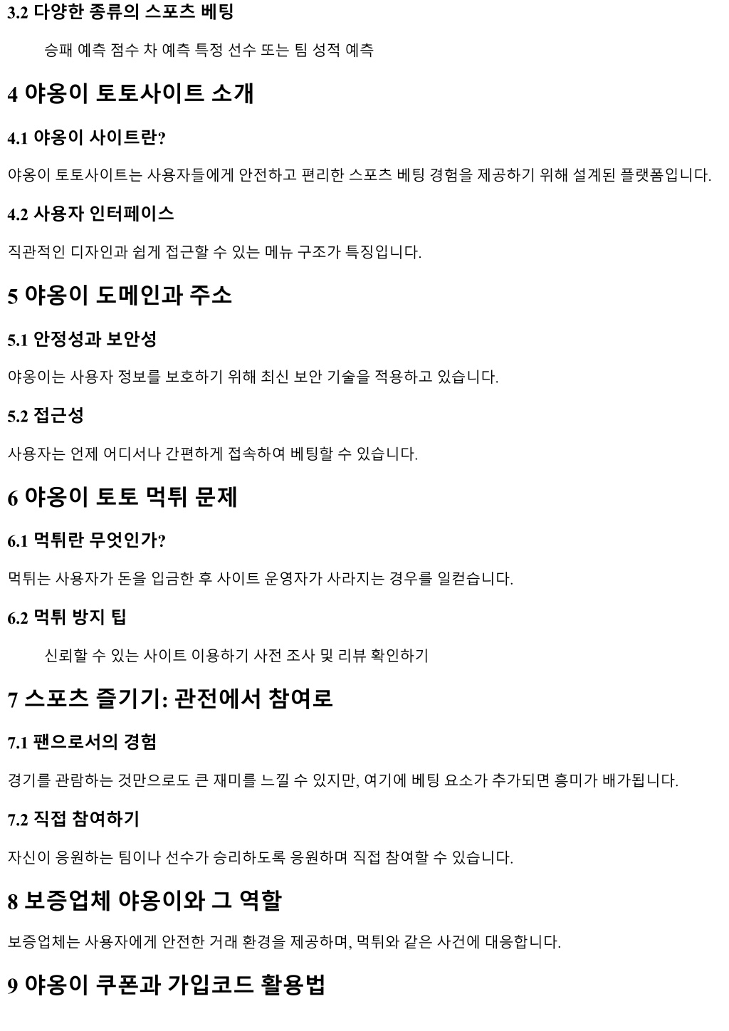 2. 3.2 다양한종류의스포츠베팅 승패예측점수차예측특정선수또는팀성적예측 4 야옹이토토사이트소개 4.1 야옹이사이트란? 야옹이토토사이트는사용자들에게안전하고편리한스포츠베팅경험을제공하기위해설계된플랫폼입니다. 4.2 사용자인터페이스 직관적인디자인과쉽게접근할수있는메뉴구조가특징입니다. 5 야옹이도메인과주소 5.1 안정성과보안성 야옹이는사용자정보를보호하기위해최신보안기술을적용하고있습니다. 5.2 접근성 사용자는언제어디서나간편하게접속하여베팅할수있습니다. 6 야옹이토토먹튀문제 6.1 먹튀란무엇인가? 먹튀는사용자가돈을입금한후사이트운영자가사라지는경우를일컫습니다. 6.2 먹튀방지팁 신뢰할수있는사이트이용하기사전조사및리뷰확인하기 7 스포츠즐기기: 관전에서참여로 7.1 팬으로서의경험 경기를관람하는것만으로도큰재미를느낄수있지만, 여기에베팅요소가추가되면흥미가배가됩니다. 7.2 직접참여하기 자신이응원하는팀이나선수가승리하도록응원하며직접참여할수있습니다. 8 보증업체야옹이와그역할 보증업체는사용자에게안전한거래환경을제공하며, 먹튀와같은사건에대응합니다. 9 야옹이쿠폰과가입코드활용법