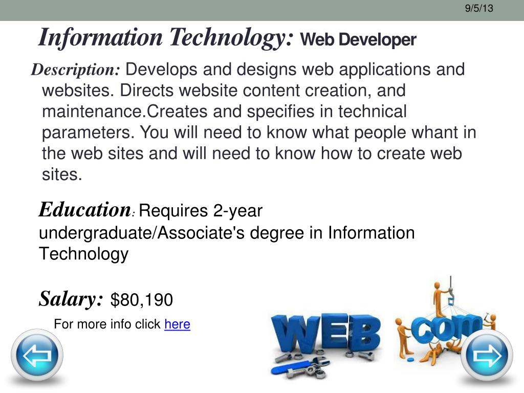 9/5/13 Information Technology:Web Developer Description: Develops and designs web applications and websites. Directs website content creation, and maintenance.Creates and specifies in technical parameters. You will need to know what people whant in the web sites and will need to know how to create web sites. Education:Requires 2-year undergraduate/Associate's degree in Information Technology Salary:$80,190 For more info click here