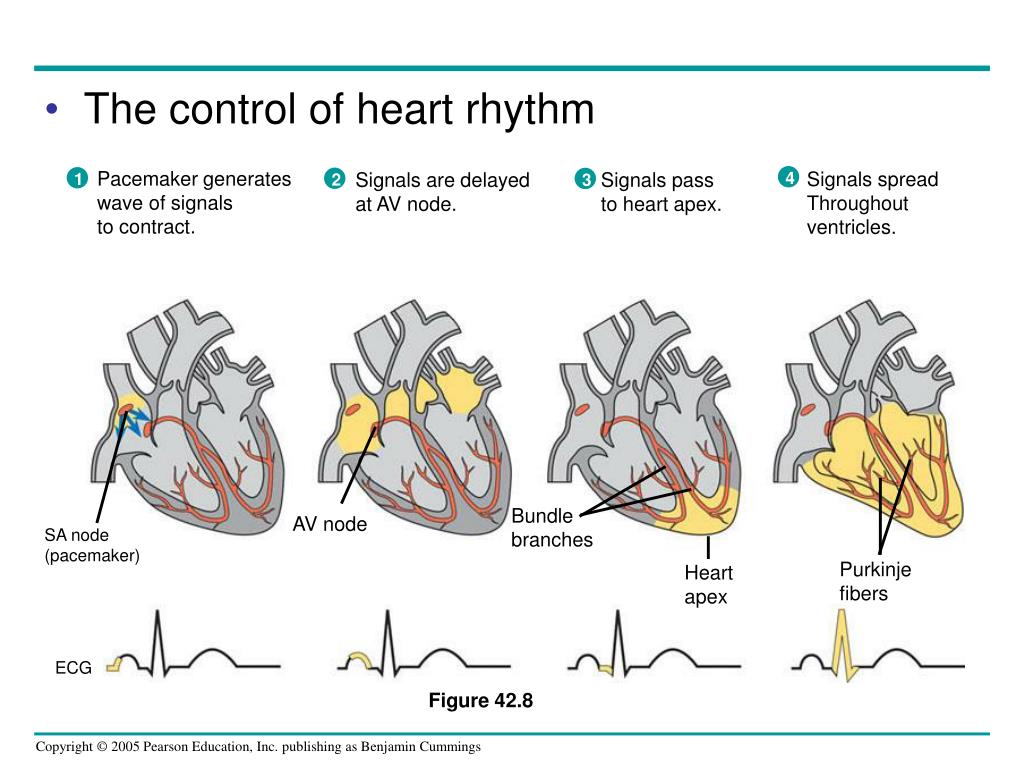 Signals pass to heart apex. Signals spread Throughoutventricles. Pacemaker generates wave of signals to contract. Signals are delayed at AV node. Bundlebranches AV node SA node(pacemaker) Purkinjefibers Heartapex ECG 2 1 3 4 Figure 42.8 • The control of heart rhythm