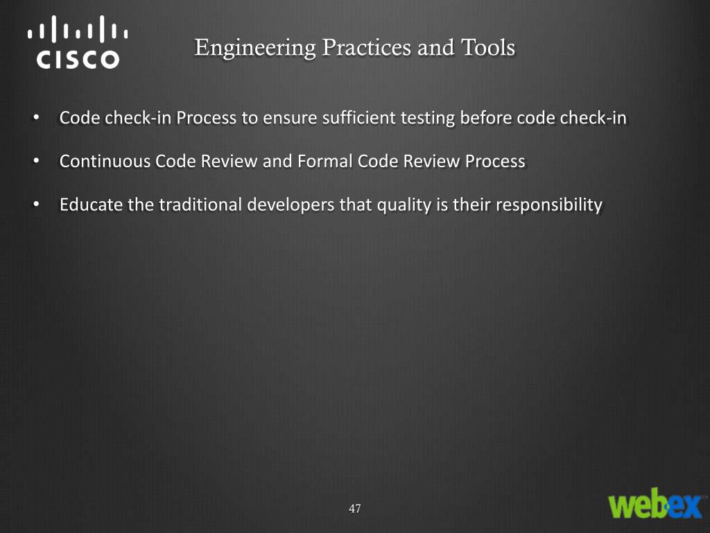 Engineering Practices and Tools • Code check-in Process to ensure sufficient testing before code check-in • Continuous Code Review and Formal Code Review Process • Educate the traditional developers that quality is their responsibility