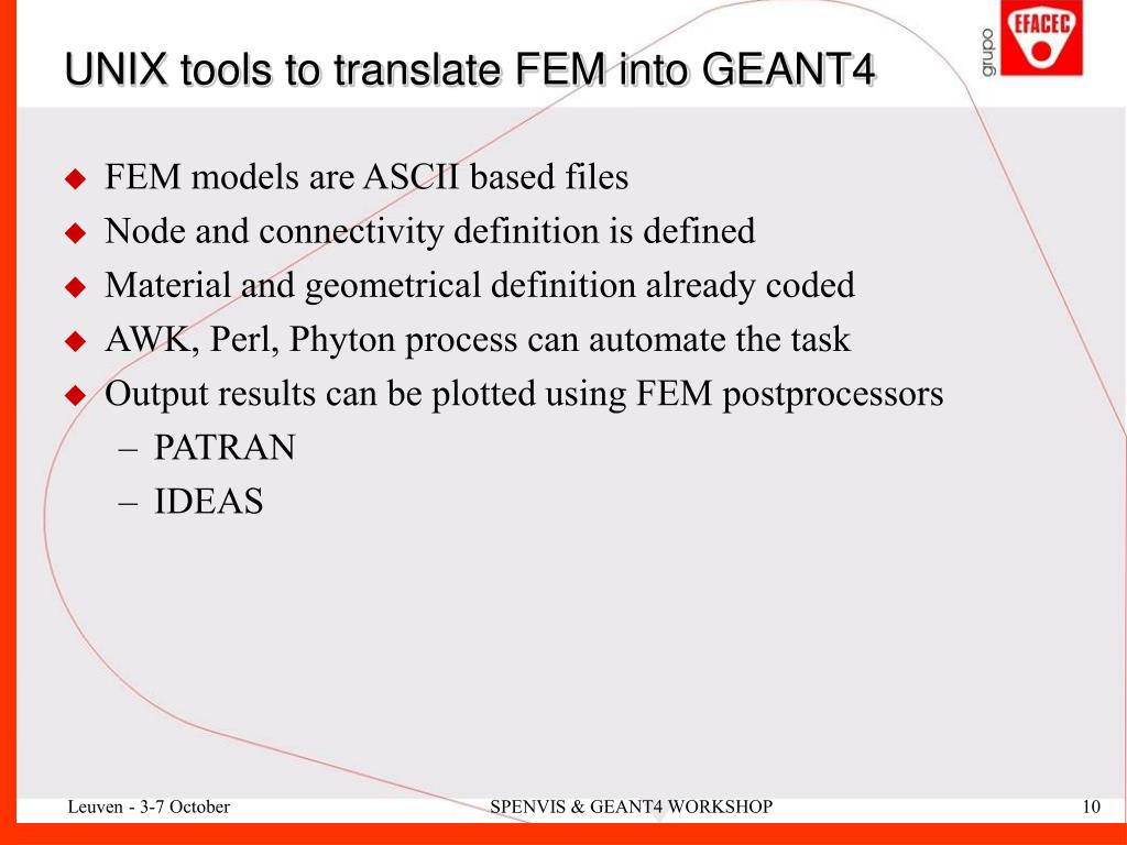 UNIX tools to translate FEM into GEANT4 • FEM models are ASCII based files • Node and connectivity definition is defined • Material and geometrical definition already coded • AWK, Perl, Phyton process can automate the task • Output results can be plotted using FEM postprocessors • PATRAN • IDEAS