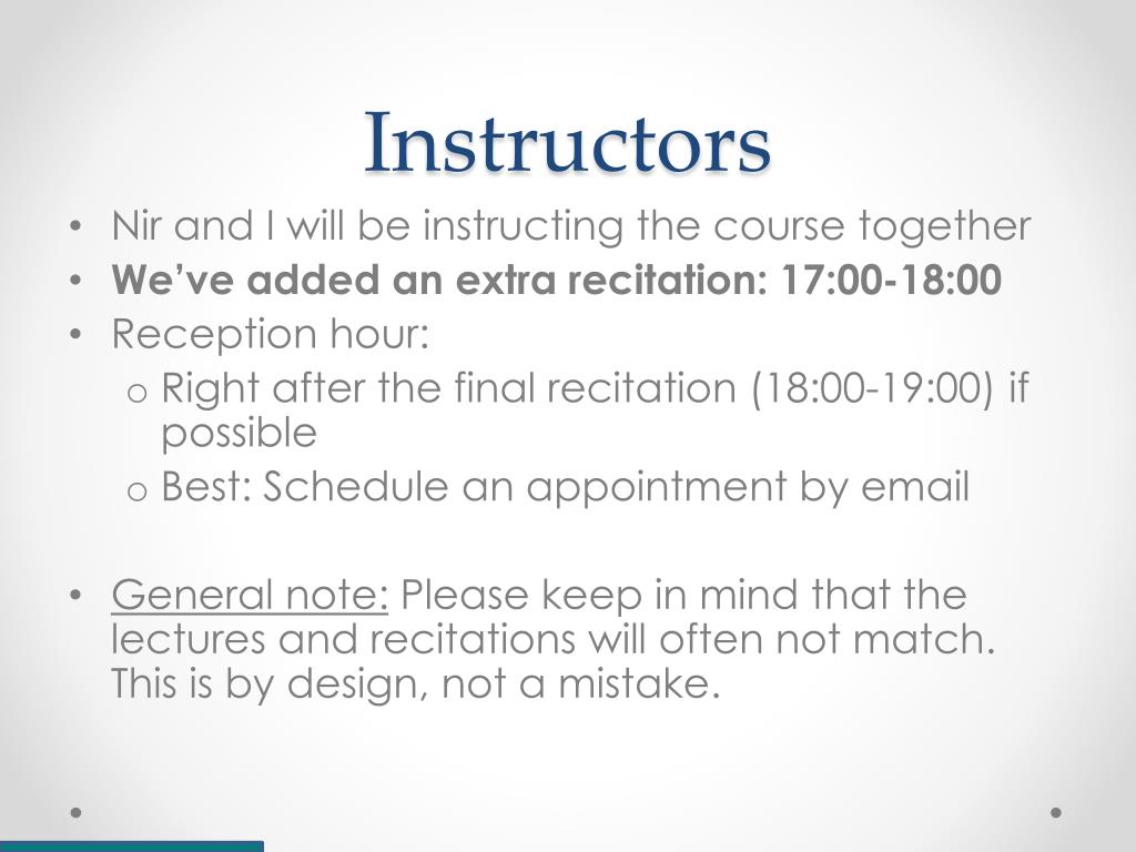 Instructors • Nir and I will be instructing the course together • We’ve added an extra recitation: 17:00-18:00 • Reception hour: • Right after the final recitation (18:00-19:00) if possible • Best: Schedule an appointment by email • General note: Please keep in mind that the lectures and recitations will often not match. This is by design, not a mistake.