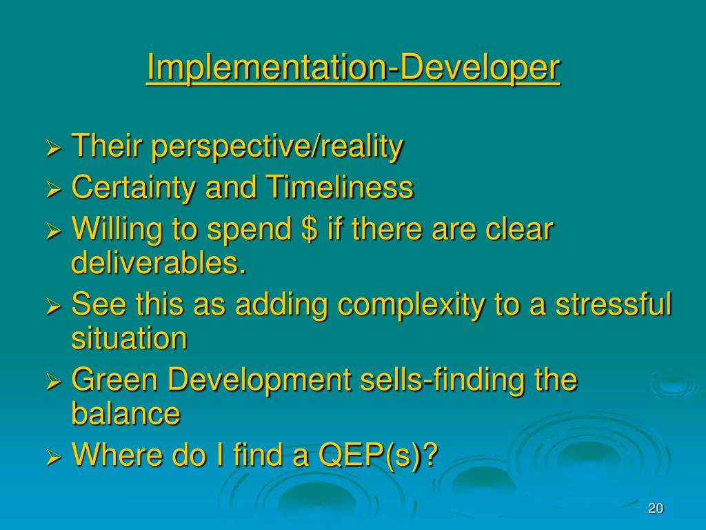 Implementation-Developer • Their perspective/reality • Certainty and Timeliness • Willing to spend $ if there are clear deliverables. • See this as adding complexity to a stressful situation • Green Development sells-finding the balance • Where do I find a QEP(s)?