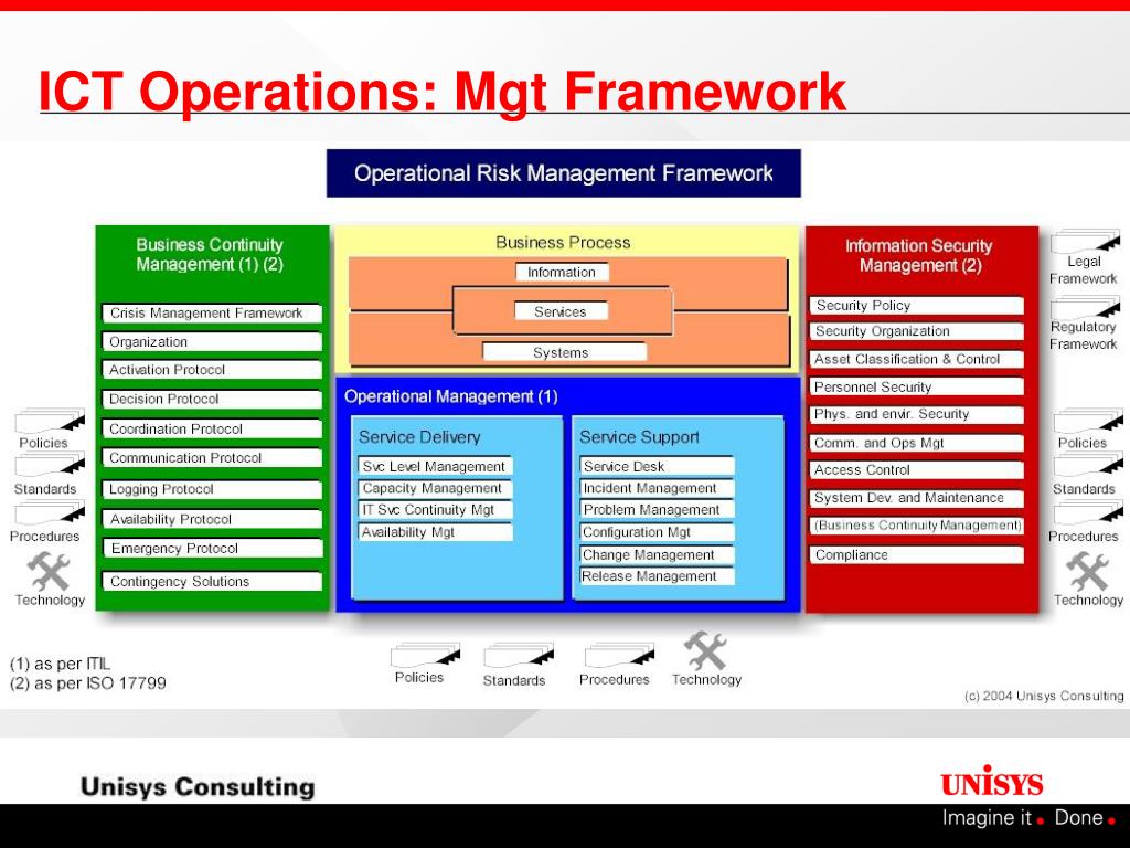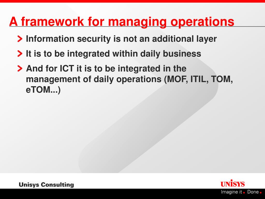 A framework for managing operations • Information security is not an additional layer • It is to be integrated within daily business • And for ICT it is to be integrated in the management of daily operations (MOF, ITIL, TOM, eTOM...)