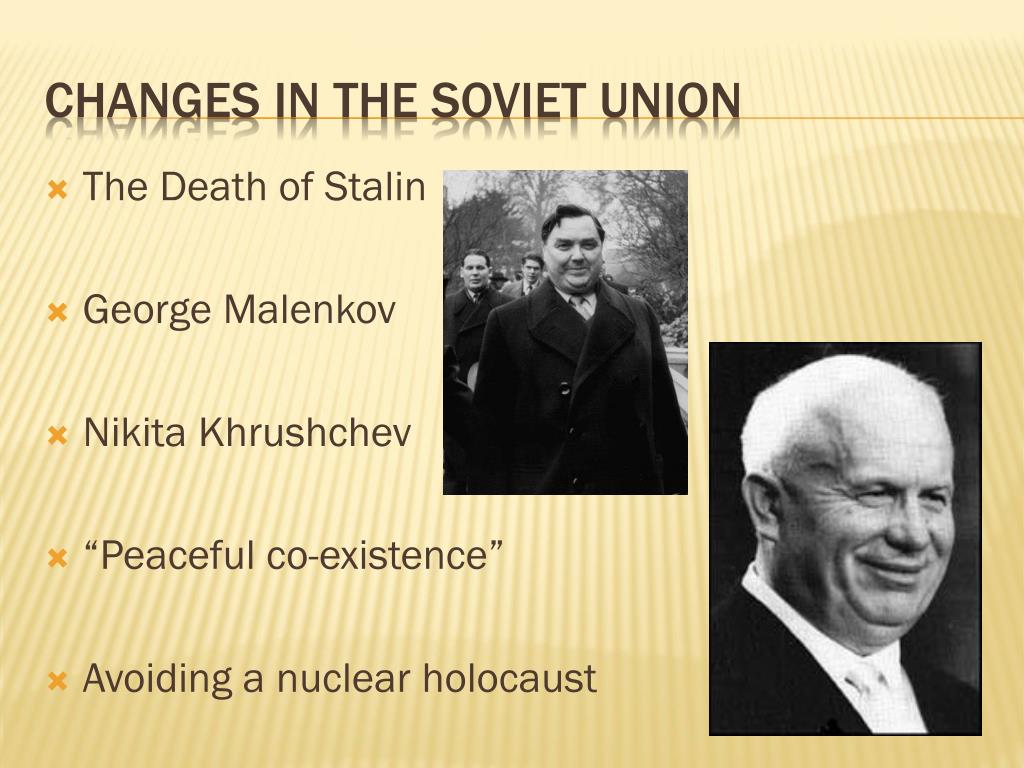 The Death of Stalin George Malenkov Nikita Khrushchev “Peaceful co-existence” Avoiding a nuclear holocaust Changes in the soviet union