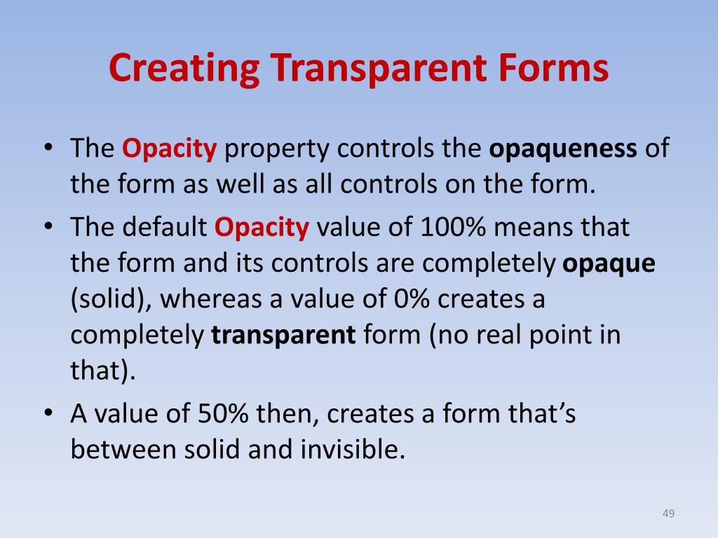 Creating Transparent Forms • The Opacity property controls the opaqueness of the form as well as all controls on the form. • The default Opacity value of 100% means that the form and its controls are completely opaque (solid), whereas a value of 0% creates a completely transparent form (no real point in that). • A value of 50% then, creates a form that’s between solid and invisible.