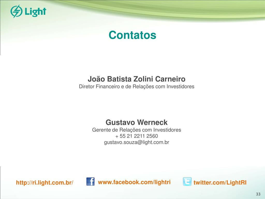 Contatos João Batista Zolini CarneiroDiretorFinanceiro e de Relações com Investidores Gustavo WerneckGerente de Relações com Investidores + 55 21 2211 2560gustavo.souza@light.com.br www.facebook.com/lightri http://ri.light.com.br/ twitter.com/LightRI 33