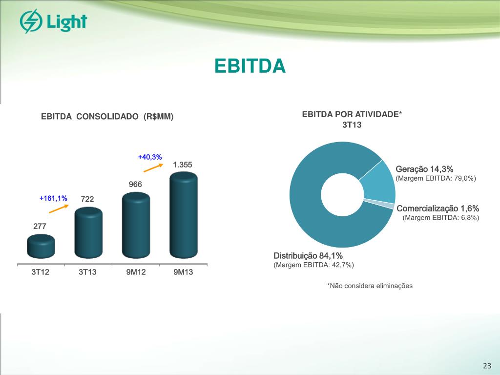 Custos e Despesas Operacionais CUSTOS GERENCIÁVEIS DA DISTRIBUIDORA (R$MM) CUSTOS (R$MM)* 3T13 +3,4% 987 Não gerenciáveis (distribuição): R$ 615 (54,3%) 954 Geração eComercialização: R$ 206 (18,2%) +4,3% 312 299 Gerenciáveis (distribuição): R$ 312 (27,5%) 3T13 9M13 3T12 9M12 *Não considera eliminações ** Não considera custo de construção 22