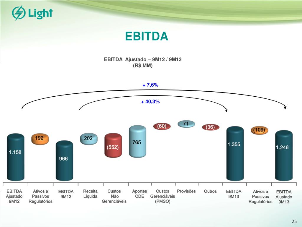 EBITDA EBITDA Ajustado – 3T12 / 3T13(R$ MM) - 0,6% + 161,1% (8) 12 (22) 303 (329) 100 722 119 59 393 395 277 ReceitaLíquida Custos NãoGerenciáveis Aporte CDE CustosGerenciáveis (PMSO) Provisões EBITDA Ajustado3T12 Ativos e PassivosRegulatórios Outros EBITDA3T13 Ativos e PassivosRegulatórios EBITDA3T12 EBITDA Ajustado3T13 24
