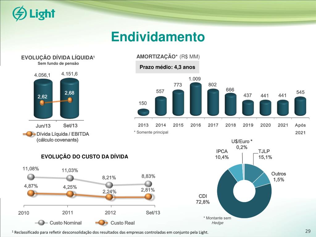Endividamento AMORTIZAÇÃO* (R$ MM) EVOLUÇÃO DÍVIDA LÍQUIDA¹ Sem fundo de pensão Prazo médio: 4,3 anos 4.151,6 4.056,1 1.009 802 773 666 557 545 2,68 437 441 441 2,62 150 Set/13 Jun/13 * Somente principal Dívida Líquida / EBITDA (cálculo covenants) U$/Euro * 0,2% IPCA 10,4% TJLP15,1% EVOLUÇÃO DO CUSTO DA DÍVIDA 11,08% 11,03% Outros 1,5% 8,83% 8,21% 4,87% 4,25% 2,81% 2,24% CDI72,8% 2011 2012 Set/13 2010 * Montante sem Hedge Custo Nominal Custo Real 29 1 Reclassificado para refletir desconsolidação dos resultados das empresas controladas em conjunto pela Light.