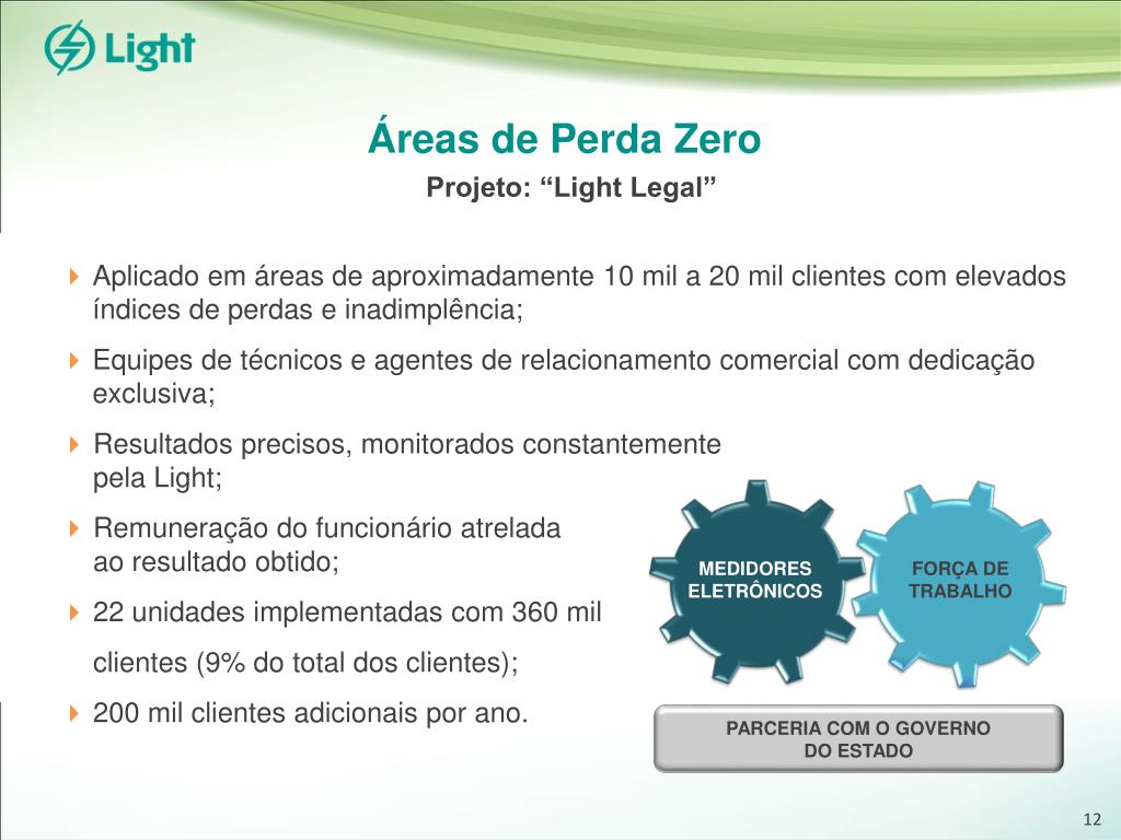 Programa de Novas Tecnologias A Light busca reduzir as perdas através de investimentos em novas tecnologias, integração das atividades operacionais, aumento na conscientização da população e parcerias com outros agentes. Projeto de Blindagem da Rede • Tecnologia usada em áreas onde medidas convencionais não são efetivas • Áreas que apresentam altos níveis de perdas não técnicas Sala de controle Redeatual Redeblindada Médiatensão Medidor centralizado Média tensão Baixa tensão Baixatensão 9 m 3 m Medidoreletromecânico Display 11