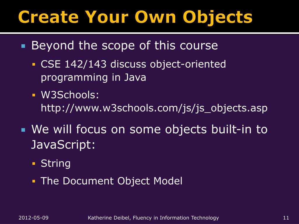 Create Your Own Objects • Beyond the scope of this course • CSE 142/143 discuss object-oriented programming in Java • W3Schools: http://www.w3schools.com/js/js_objects.asp • We will focus on some objects built-in to JavaScript: • String • The Document Object Model Katherine Deibel, Fluency in Information Technology