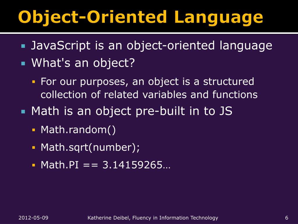 Object-Oriented Language • JavaScript is an object-oriented language • What's an object? • For our purposes, an object is a structured collection of related variables and functions • Math is an object pre-built in to JS • Math.random() • Math.sqrt(number); • Math.PI == 3.14159265… Katherine Deibel, Fluency in Information Technology