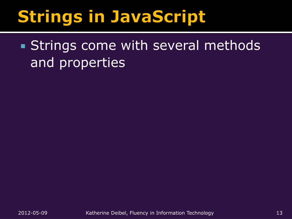 Strings in JavaScript • Strings come with several methods and properties Katherine Deibel, Fluency in Information Technology